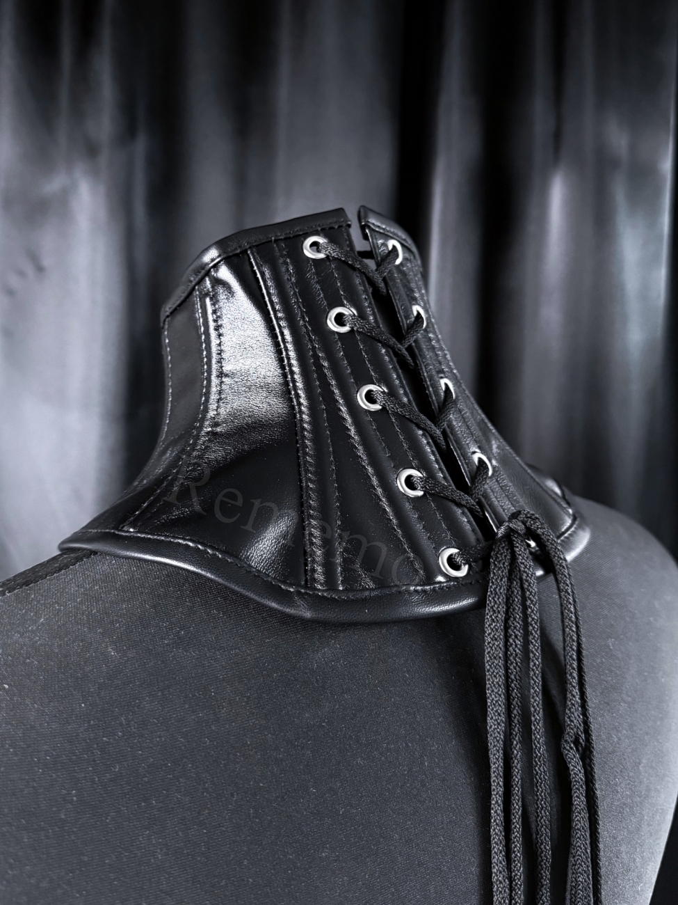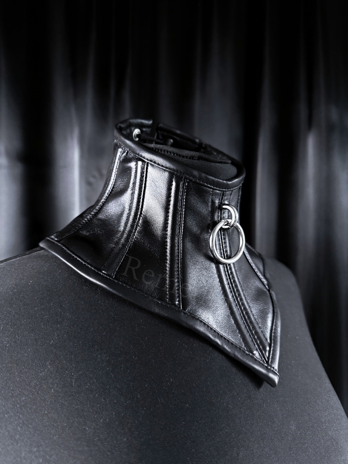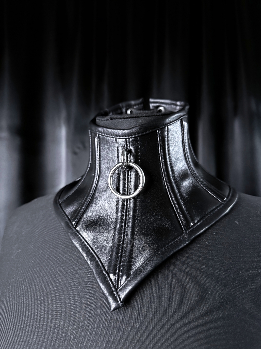Gorset na szyję z matowej sztucznej skóry włoskiej produkcji z wyrazistym kółkiem na metalowym mostku. Wiązany z tyłu, w pełni regulowany, dopasowuje się do sylwetki i pozwala na kontrolę stopnia napięcia. Minimalistyczny, a jednocześnie prowokujący detal sprawia, że idealnie wpisuje się w estetykę lekkiego bondage i BDSM. To subtelne połączenie drapieżnej odwagi i precyzyjnej formy, które przyciąga spojrzenia i dodaje pewności siebie.