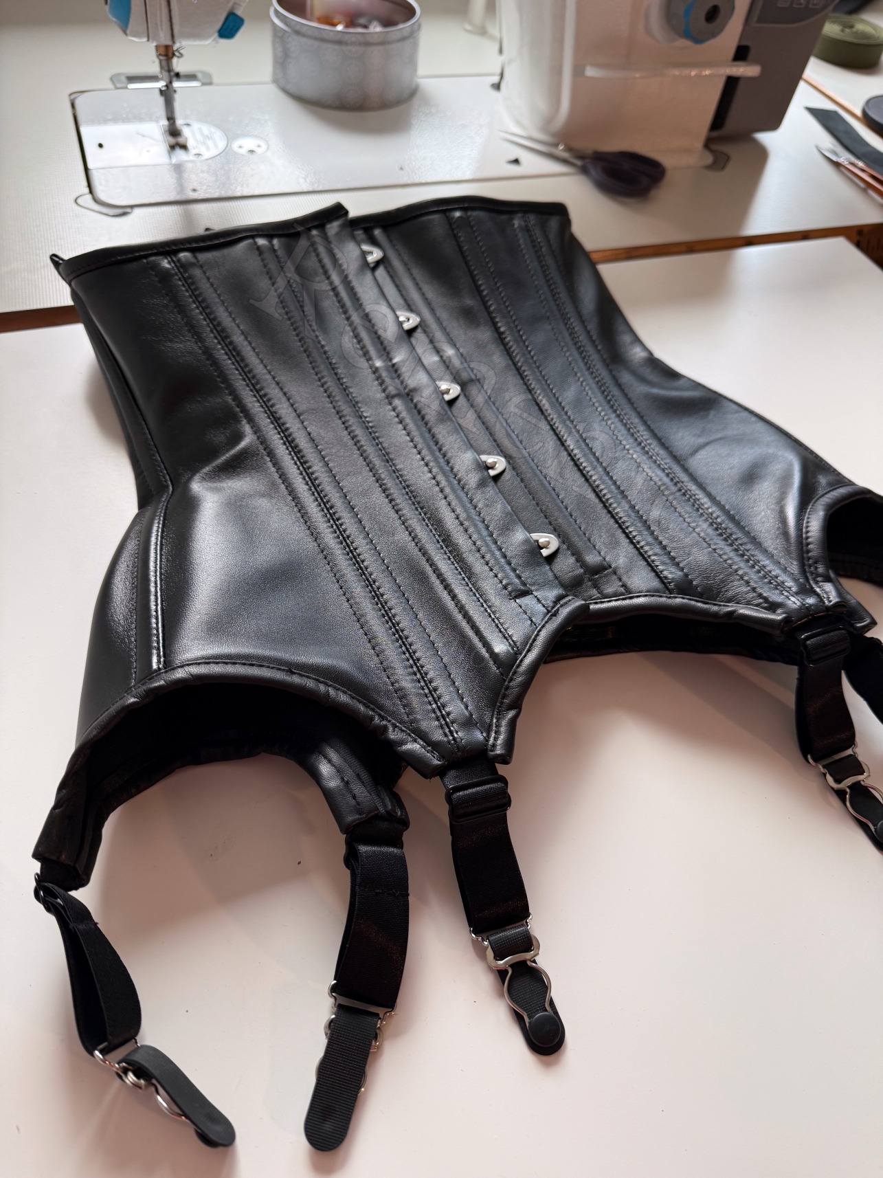 Czarny gorset pod biust ze skóry naturalnej ze stałymi podwiązkami do pończochCzarny gorset pod biust ze skóry naturalnej ze stałymi podwiązkami do pończoch
