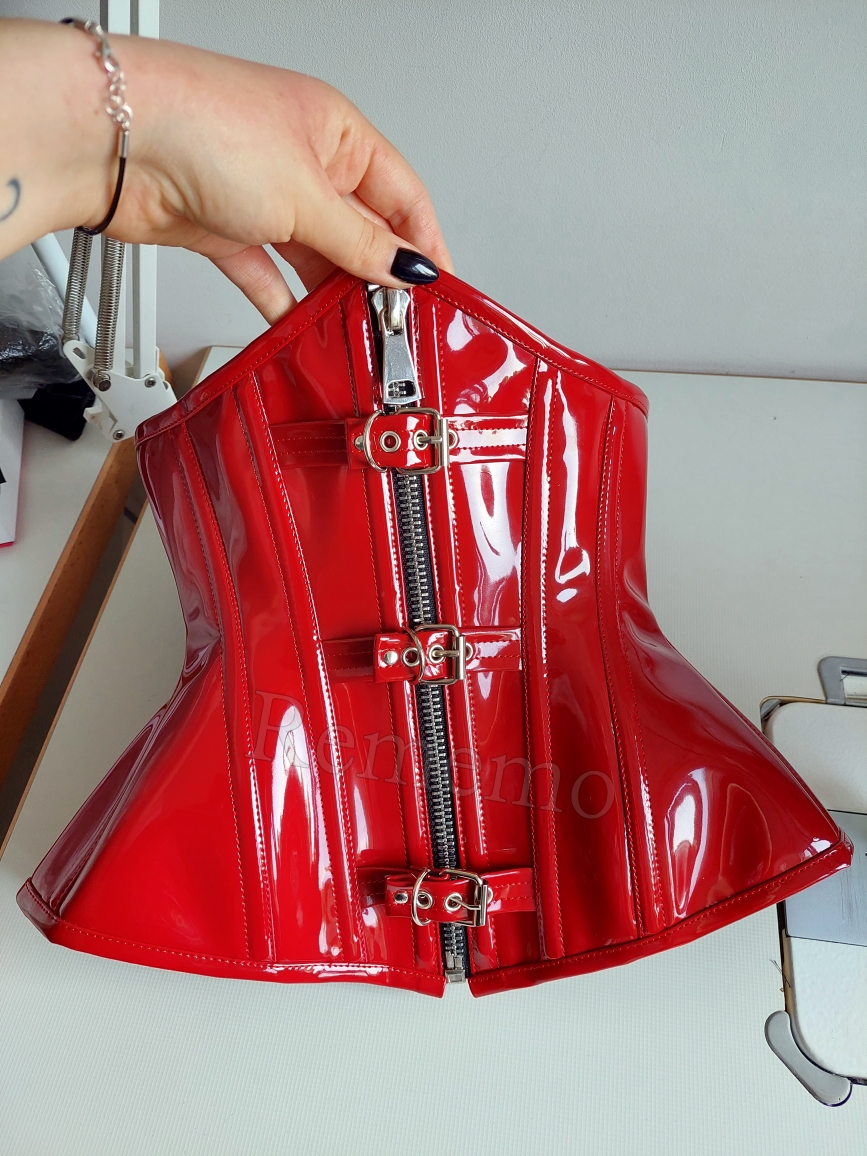 Gorset pod biust ze sztucznej lakierowanej skóry PVC z trzema klamrami i solidnym zamkiem to projekt, który mówi za Ciebie, zanim jeszcze zdążysz się odezwać. Intensywny połysk materiału odbija światło jak lustro, tworząc efekt mocny, sceniczny i nowoczesny.