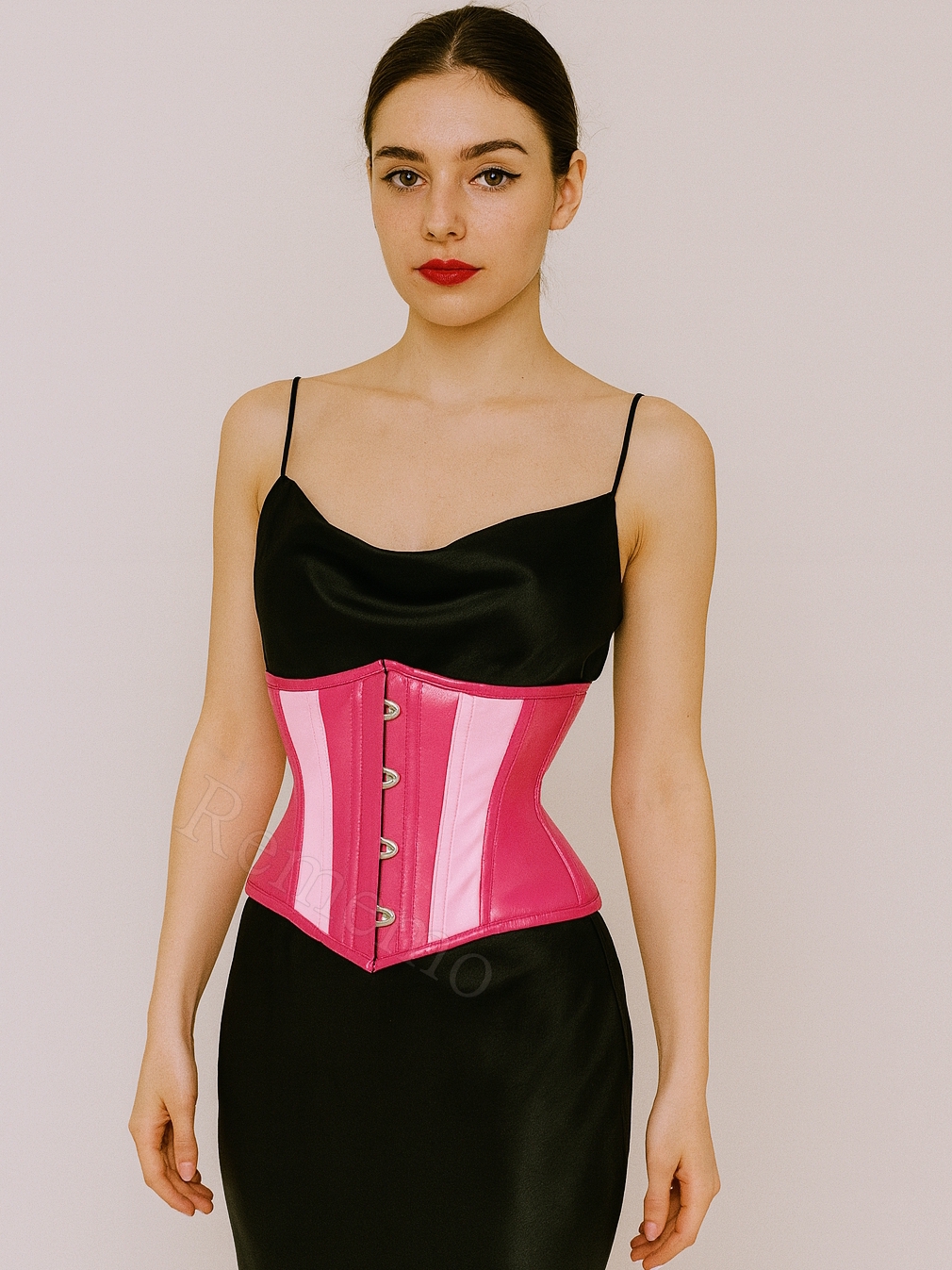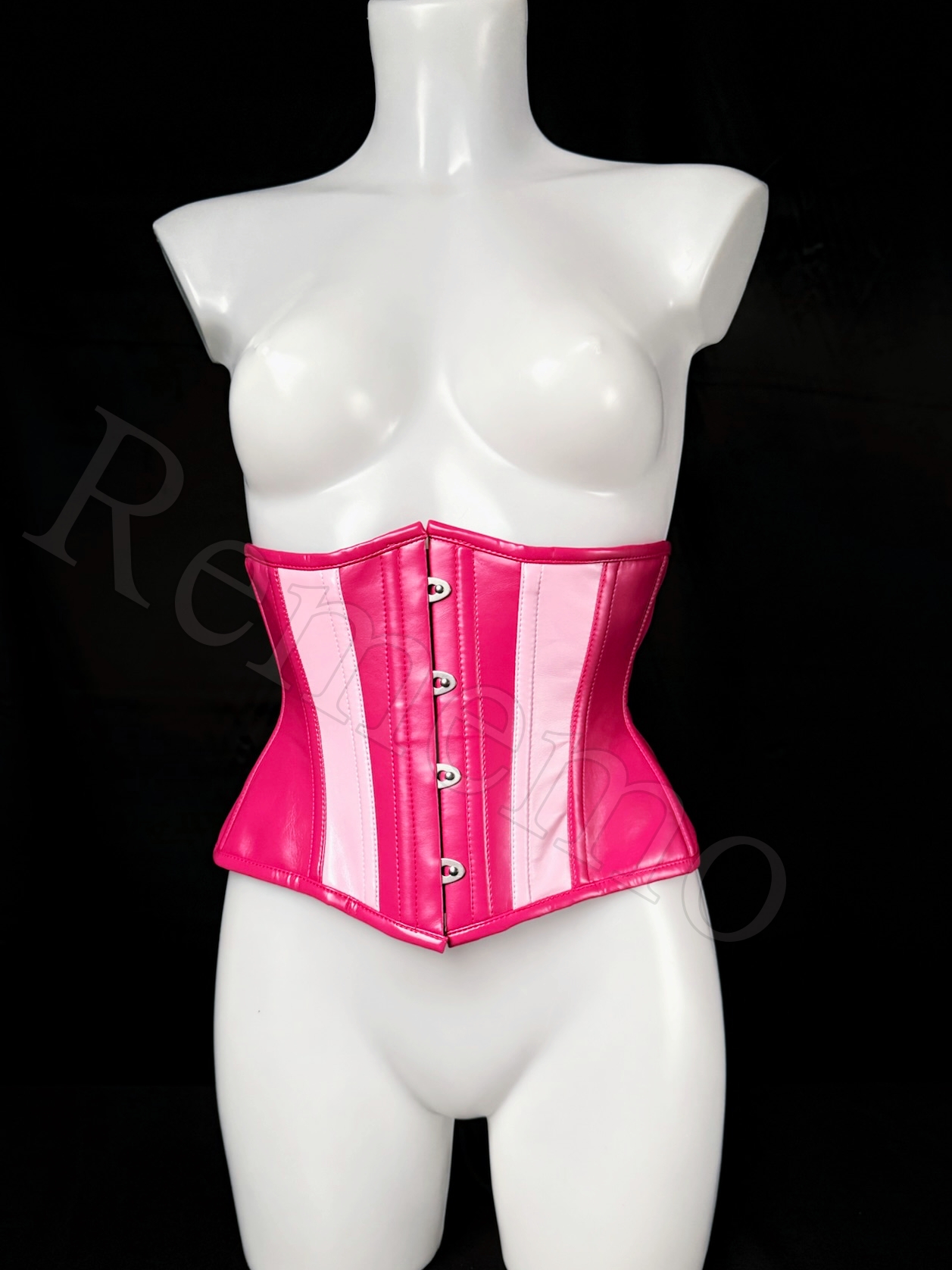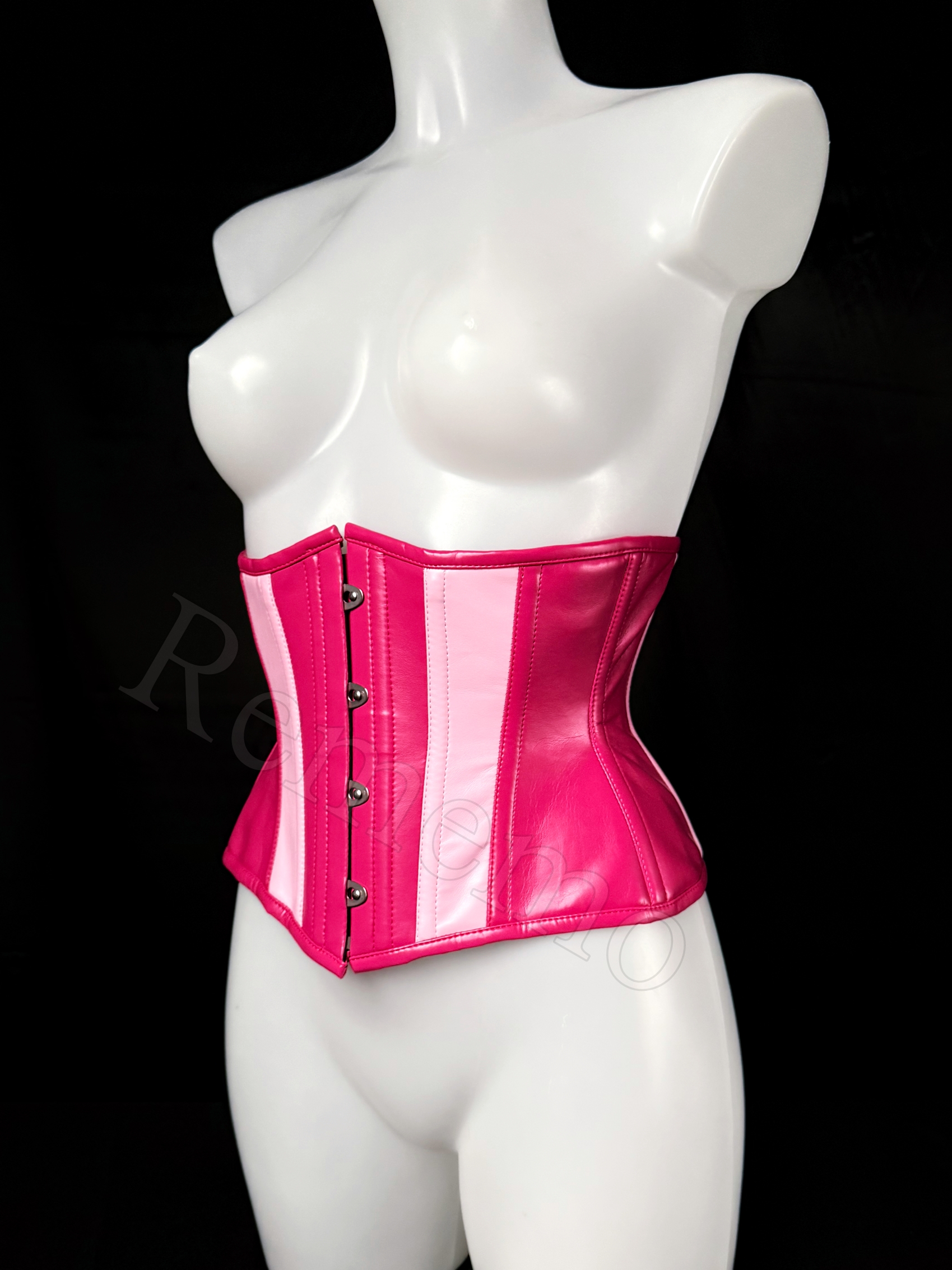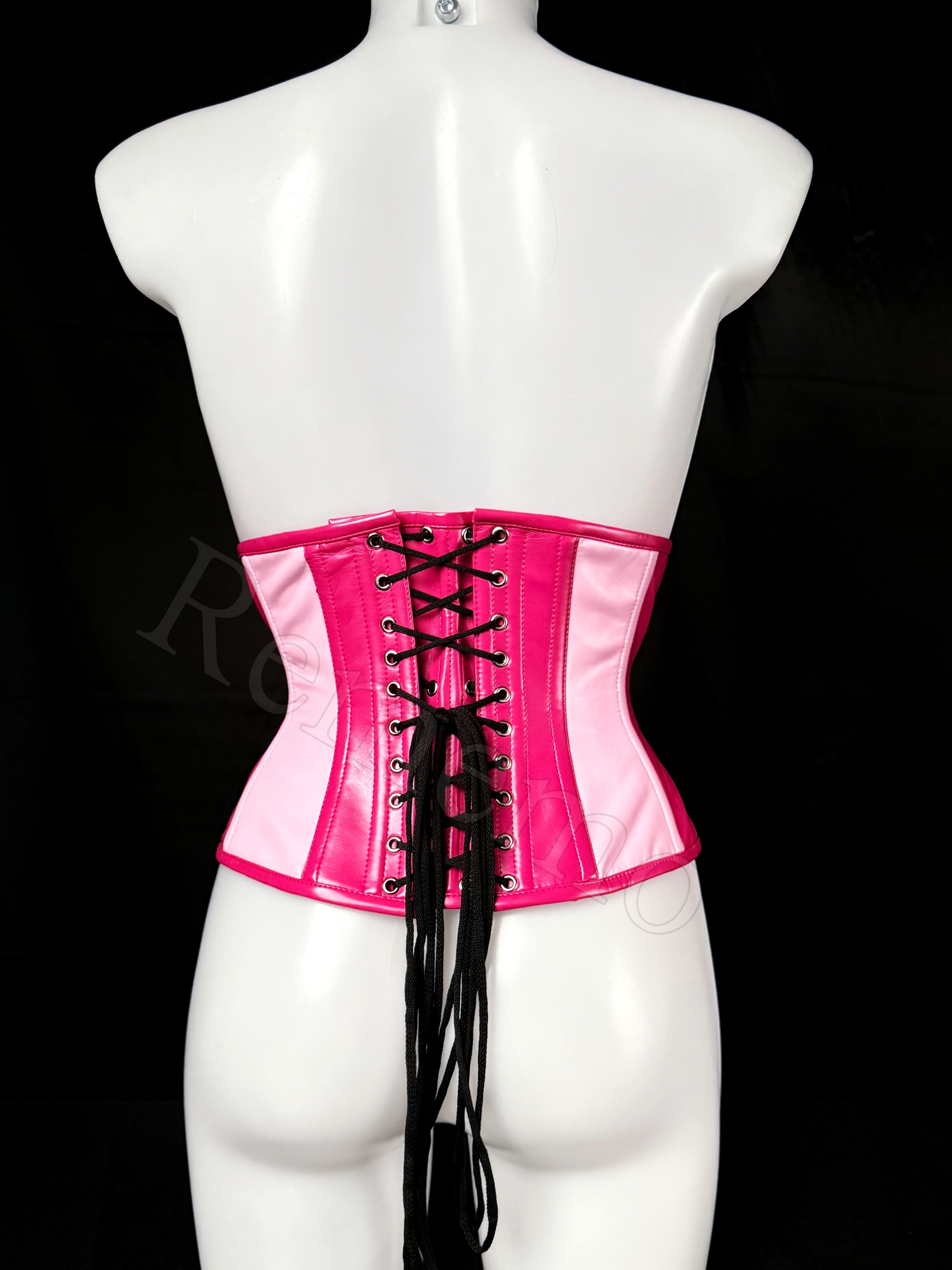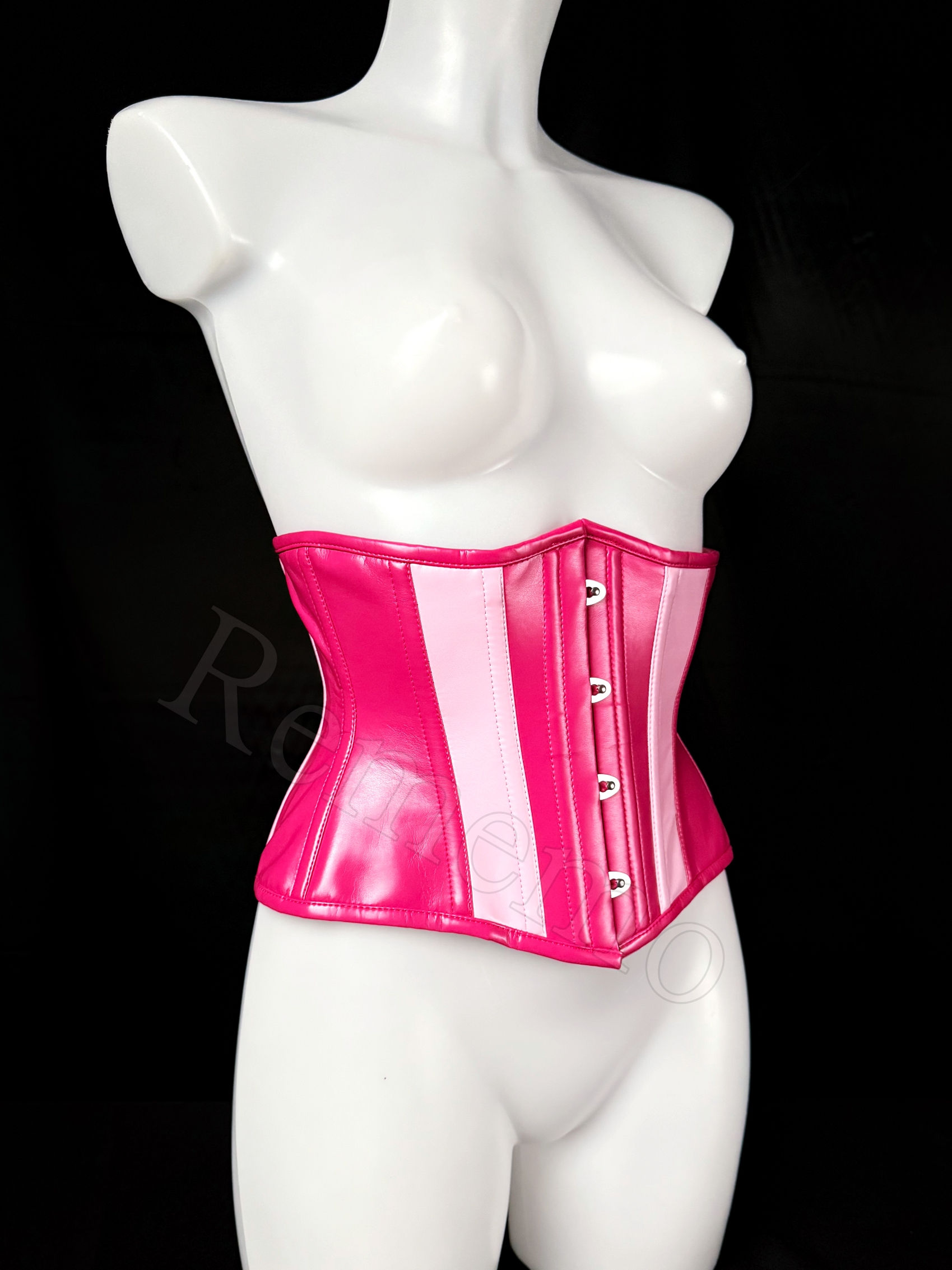 Gorset wykonany z dwóch różowych galanteryjnych sztucznych skór o matowym wykończeniu w fuksjowym oraz pudorowo-różowym kolorze. Materiał jest plastyczny, gładki i elegancki. Z przodu umieszczono srebrny metalowy busk, który wprowadza lekko industrialny ton i jednocześnie ułatwia zakładanie.