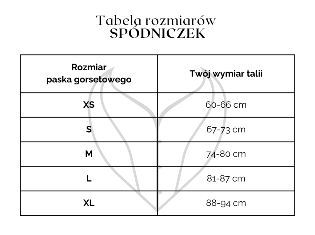 W talii znajduje się regulowany pasek zapinany na metalową sprzączkę, dzięki czemu spódniczka stabilnie przylega i łatwo dopasowuje się do ciała. Można nosić ją samodzielnie lub jako komplet z gorsetem – w zestawie efekt talia–biodra staje się jeszcze bardziej wyrazisty i spektakularny.