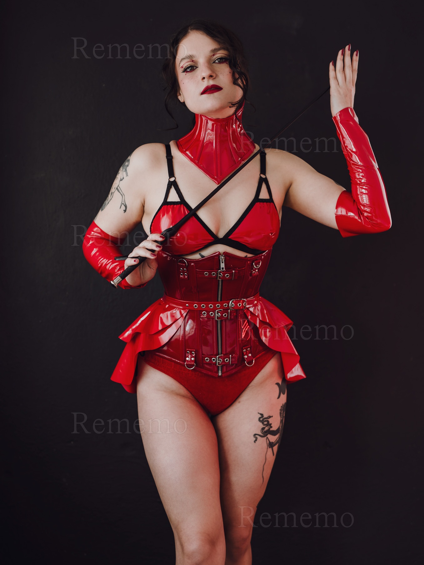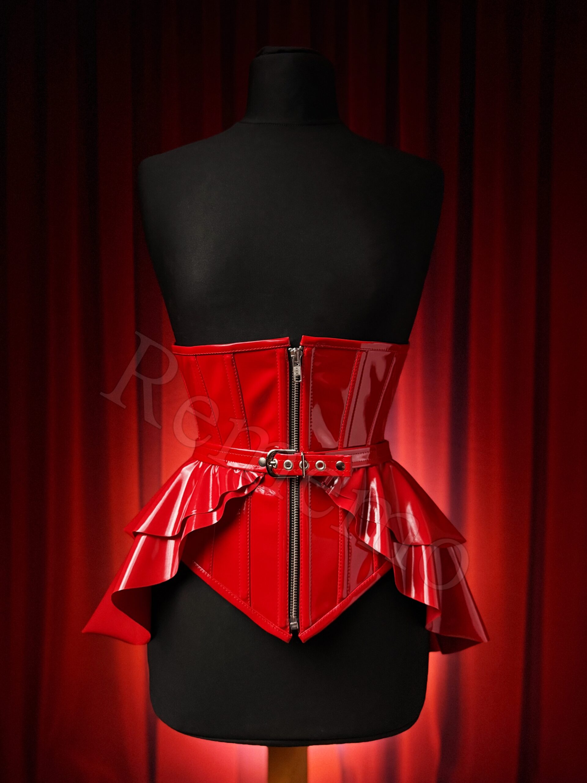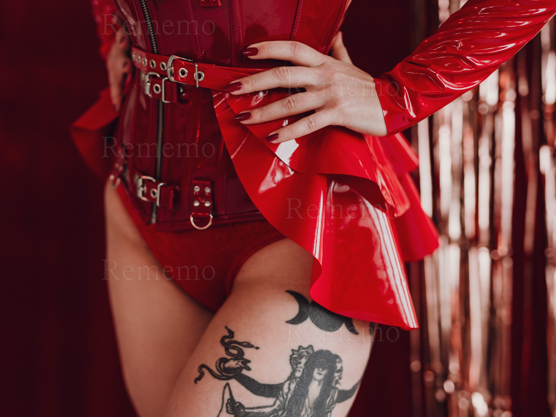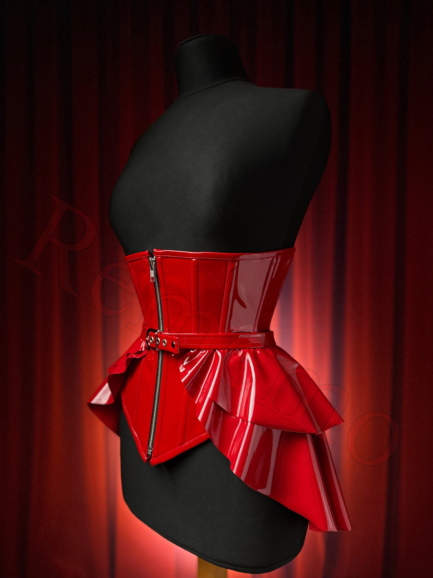 Czerwona spódniczka peplum wykonana z miękkiego PVC (tzw. lacku), który pięknie odbija światło i układa się w pełne, zmysłowe fale. Dwie warstwy materiału tworzą efektowne falbany, dodające objętości w okolicy bioder i podkreślające proporcje sylwetki.