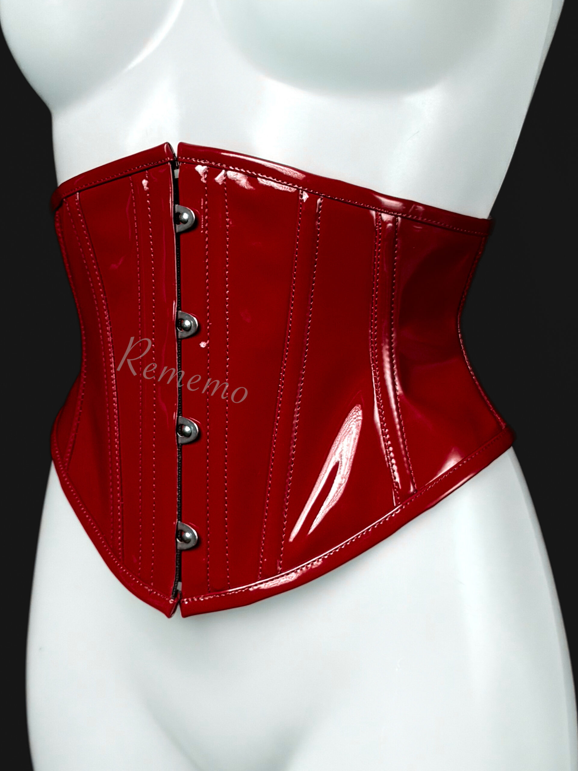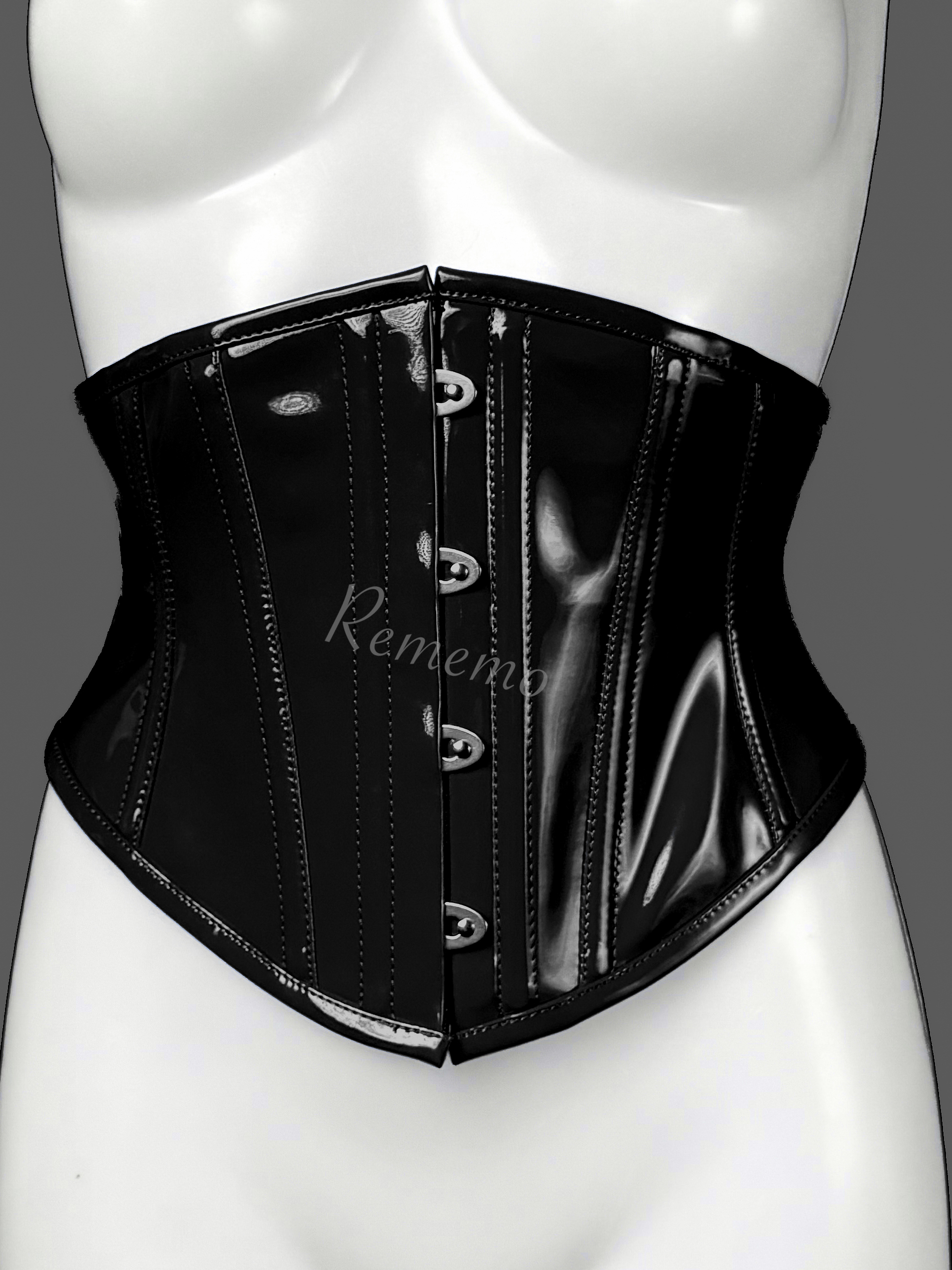 Gorset modelujący typu waspie o wydłużonej linii przodu, zaprojektowany tak, by subtelnie wysmuklać sylwetkę i skutecznie maskować okolice brzucha. Wykonany z błyszczącej, lakierowanej wegańskiej skóry PVC, przyciąga światło i tworzy wyrazisty, nowoczesny efekt. Klasyczne wiązanie na sznurek pozwala precyzyjnie dopasować gorset do ciała i kontrolować stopień taliowania.